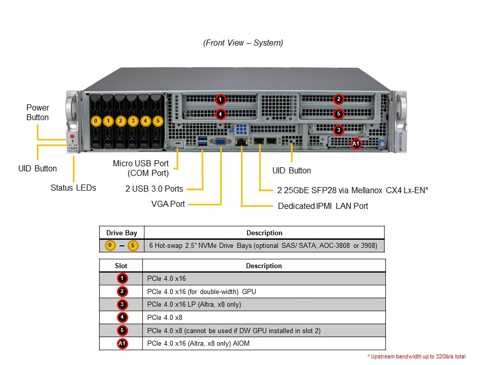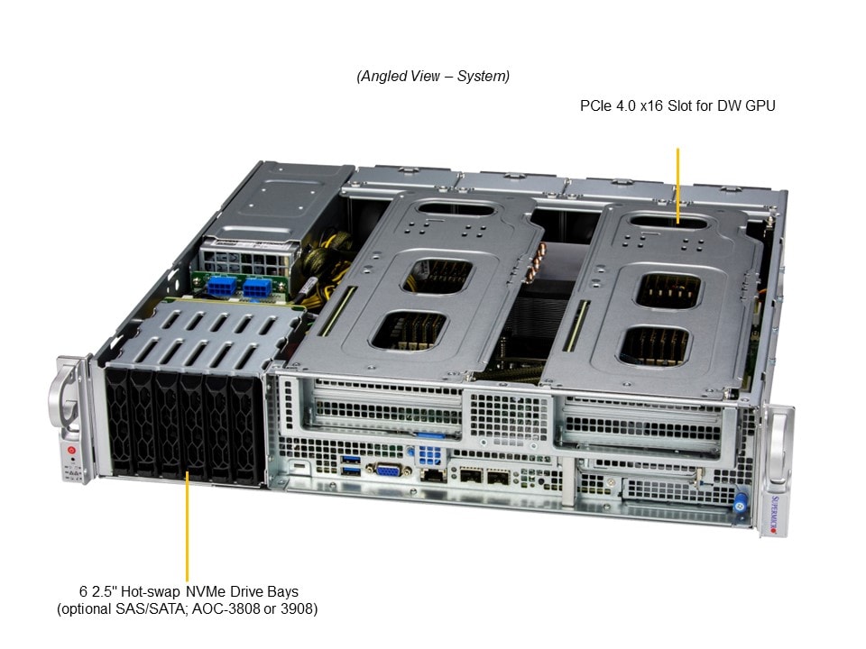 3. Supports 1 PCIe 4.0 x16 Double Wide FPFL GPU Card (or 1 PCIe 4.0 x16 FPFL Single Slot and 1 PCIe 4.0 x8 FPFL Single Slot), 1 PCIe 4.0 x16 FPHL Slot, 1 PCIe 4.0 x8 FPHL Slot, 1 PCIe 4.0 x16 LP Slot, 1 AIOM Slot (OCP3.0 Mezzanine Compatible)