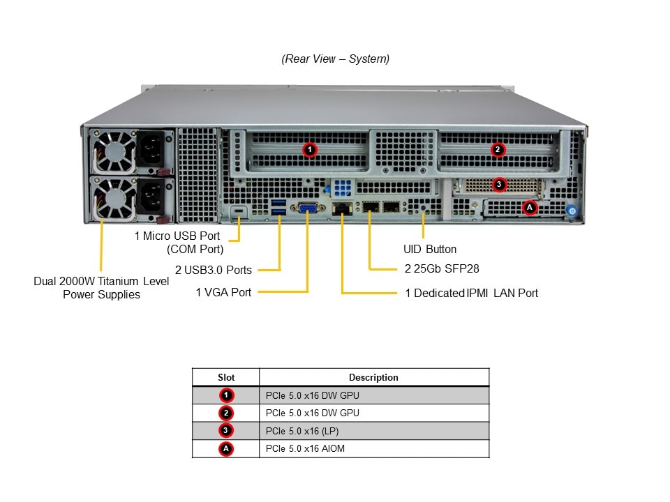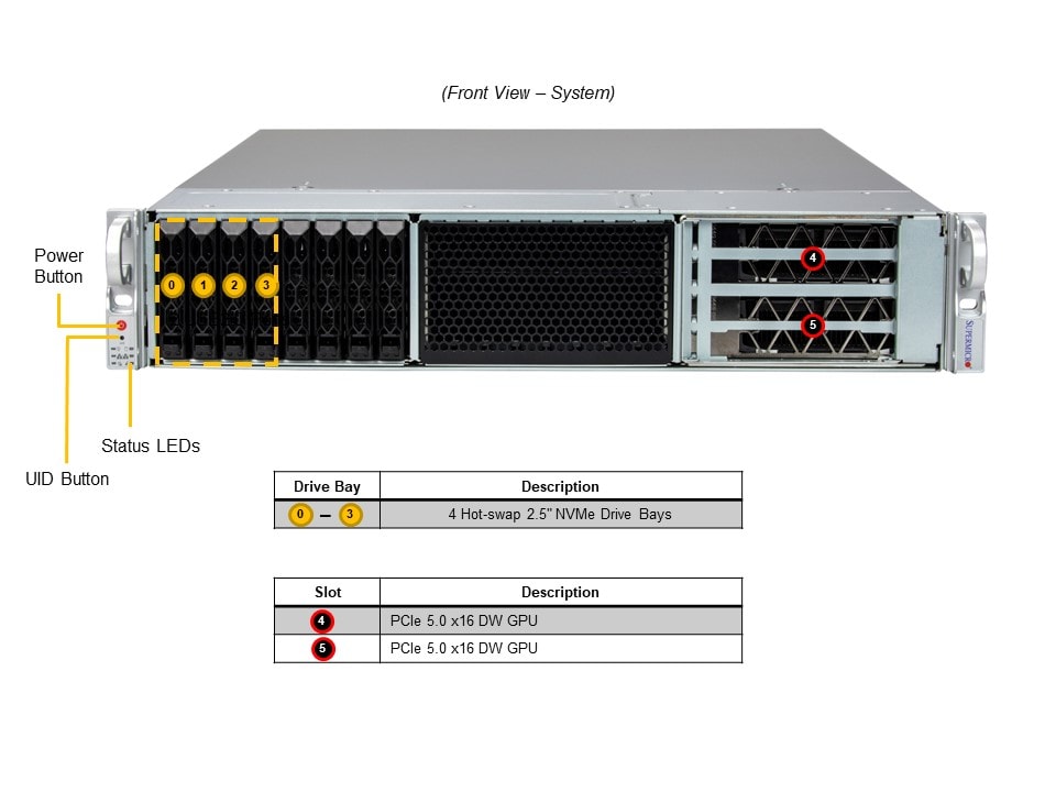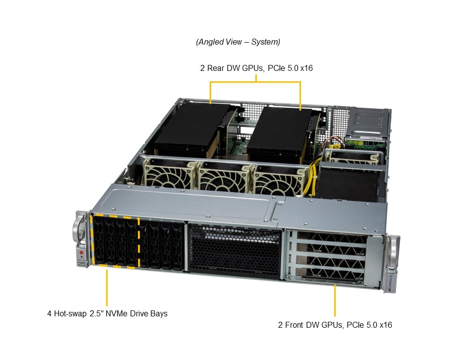 3. Supports up to 4 PCIe 5.0 x16 Double Wide GPU Cards (Up to 300W per GPU), 1 PCIe 5.0 x16 LP Slot, 1 AIOM Slot (OCP3.0 Mezzanine Compatible)