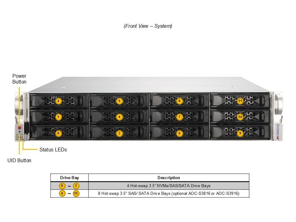 5. 12x 3.5" Hot-Swap Drive Bays (4x Hybrid +8x SAS/SATA). Optional up to 4x 2.5" drive bay at the rear