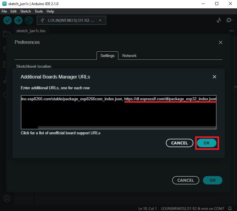 In the “Additional Boards Manager URLs” field, add the following URL: https://dl.espressif.com/dl/package_esp32_index.json (If you have more than one, they can be separated by a comma)
